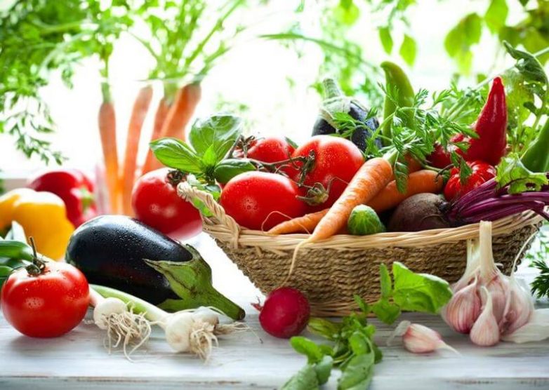 Овощи: зеленый салат, помидоры, капуста брокколи, лук;
