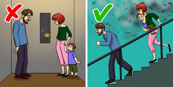 Ошибка, которая, вероятно, станет наиболее опасной. Как правило, при пожаре в здании отключают электроэнергию, лифт останавливается. Нет ничего хуже, чем оказаться в небольшом плохо вентилируемом помещении без возможности выбраться из него.
