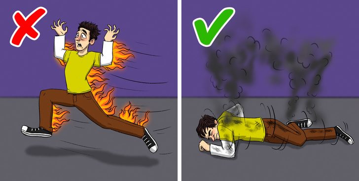 Если почувствовали, что на вас загорелась одежда, то бежать — худший выход, потому что это еще больше разожжет пламя. В таком случае нужно пересилить себя и снять горящую вещь либо лечь на землю и кататься в разные стороны.