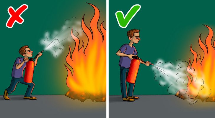 Не каждый день нам приходится пользоваться огнетушителем, а многие так и вовсе не делали этого ни разу. Не следует выпускать все содержимое в середину пламени, правильно будет, прерывисто зажимая ручку запуска, направить струю на источник воспламенения.