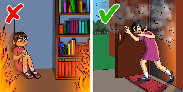 Заметив пожар, в первую очередь нужно оценить возможность выхода на улицу. В особенности не стоит искать укрытие в ванной, кладовой и подвальной комнатах. Огонь может дойти и туда, а спасателям сложнее будет вас отыскать.