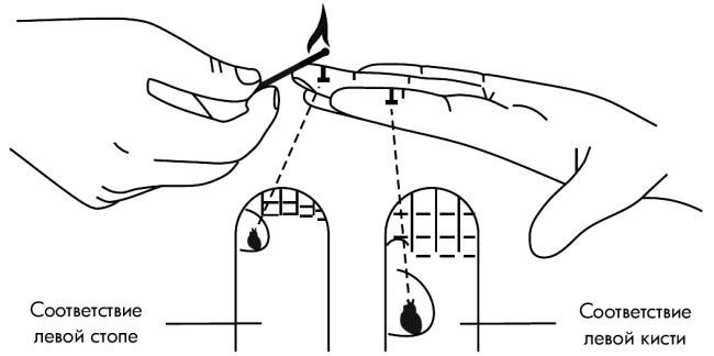 РИС. 3. Прогревание зоны соответствия сердцу при болях в мини-системах нитевидными моксами
