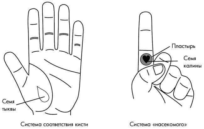 Крупные семена, например семена тыквы, хорошо применять в стандартной системе соответствия, ведь по размеру они соответствуют области проекции сердца.Семена меньшего размера удобно применять в системе «насекомого».При болях в сердце также можно использовать семена свеклы, гречихи, шиповника, редиса, плоды боярышника. Можно покрывать ими всю зону соответствия.