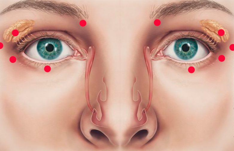 Расположите средние или большие пальцы рук на наружный угол верхней части вашей глазницы. (точка D на фото). Делайте массаж точек, считая до 10. Прекратите действие. Повторите упражнение троекратно.