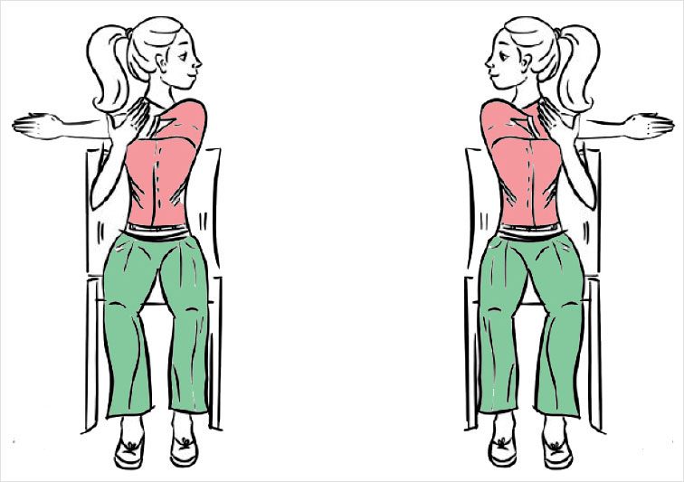 Показания: профилактика остеохондроза позвоночника грудного и шейного отделов.И. П. Сидя с прямой спиной на стуле, ноги на ширине плеч.