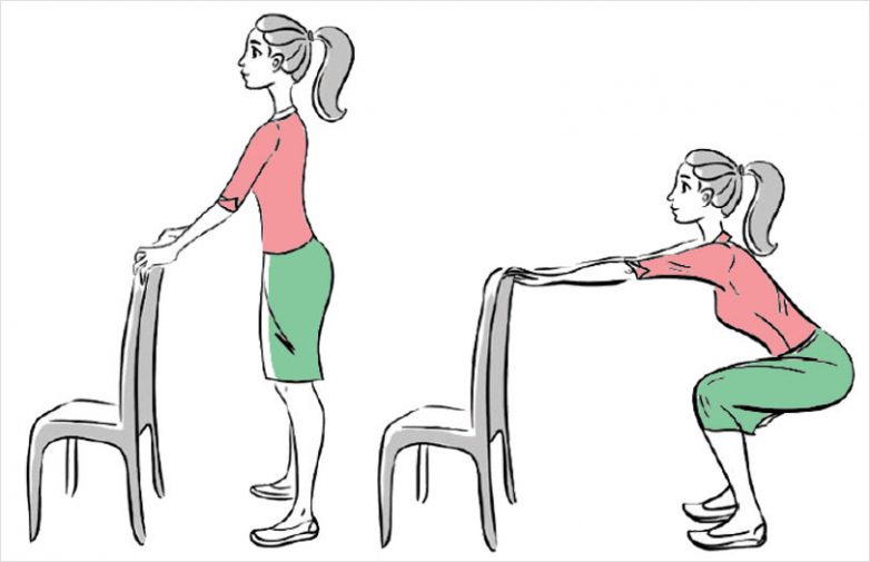 Из положения стоя медленно согните ноги в коленях и сядьте на воображаемый стул. В идеале в самой нижней точке угол между бедром и голенью должен составлять примерно 90 градусов. Чем ниже вы сможете опустить таз, тем эффективнее будет упражнение, но не следует опускаться ниже уровня коленей. Руки вытяните вперёд (над столом или держась за стол). Задержитесь в этой позе на 8–10 секунд. Затем сядьте на стул или постойте 10–20 секунд.