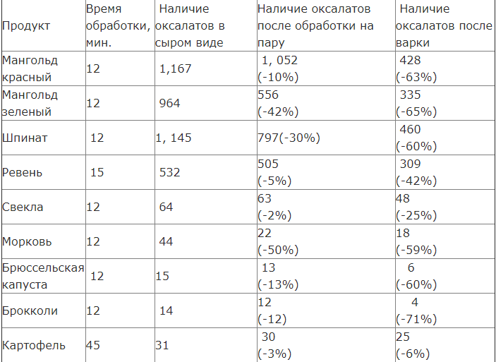 Некоторые научные выводы гласят, что недолгая варка продуктов высокооксалатного состава со сливом овощного бульона дает возможность удалить большую часть растворимых оксалатов (до 87%).