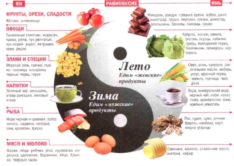 На востоке принято считать, что здоровье человека складывается из баланса противоположных энергий, которые несут в себе женское и мужское начало, дополняют друг друга и воплощают все жизненные аспекты.На баланс между Инь – женской и Ян – мужской влияют и продукты питания, поэтому при составлении рациона, следует учесть еще и этот фактор. Все продукты растительного происхождения, имеют больше энергии Инь, а мясные и молочные – Ян. Кроме этого, значение имеет и способ приготовления пищи. Самый лучший рацион должен учитывать индивидуальную потребность, сформированные привычки питания, годовые сезоны, здоровье человека – душевное и телесное.
