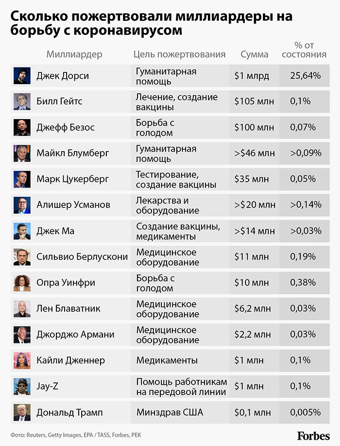 Миллиардеры из списка Forbes делятся своими капиталами ради преодоления пандемии с разной степенью щедрости. Основатель Twitter Джек Дорси отдал на это четверть всех своих денег. Самый богатый человек мира Джефф Безос пожертвовал всего 0,07% своего состояния