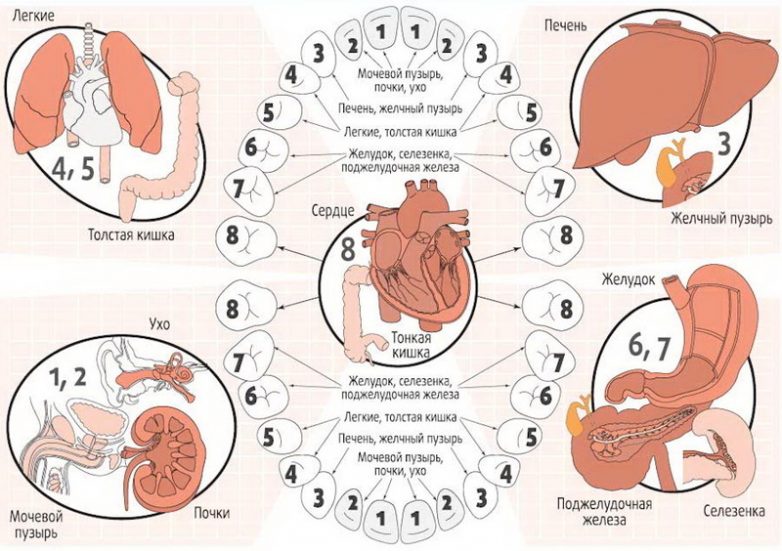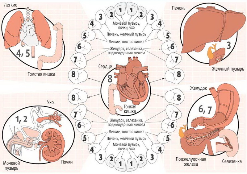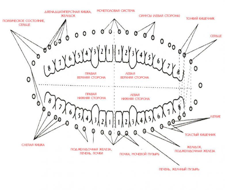 почки, печень и желчный пузырь – с резцами и клыками;толстый кишечник и желудок – передние коренные зубы и большие коренные зубы; центральная нервная система, сердце – зубы мудрости.