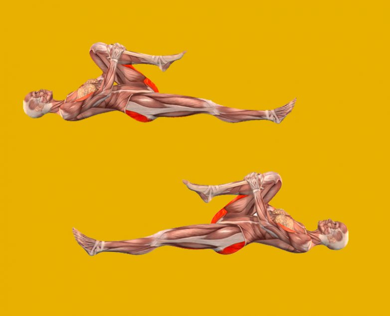 № 4. Ложимся на пол. Вытягиваем правую ногу на поверхности, другу сгибаем в колене и приближаем к животу. Фиксируем позу на полминуты. Теперь меняем позицию ног.