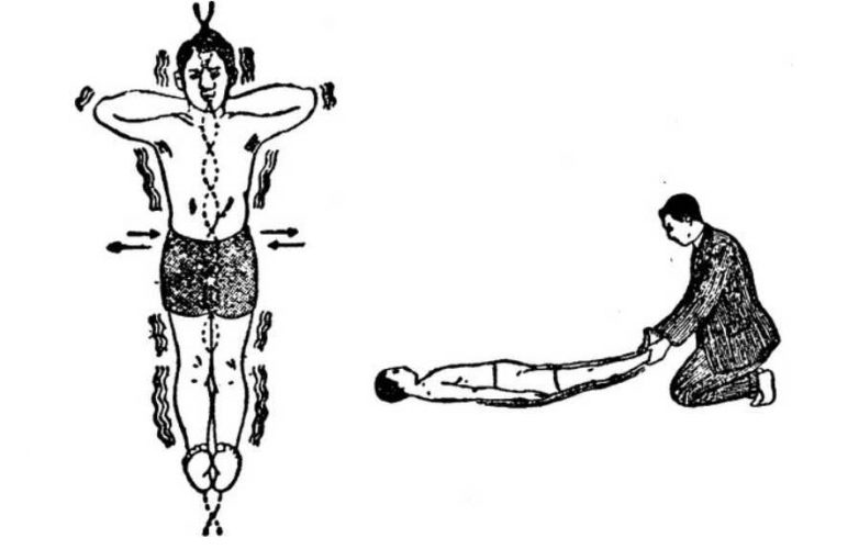Исходное положение: лечь на спину лицом вверх на твердую ровную постель или на пол, руки закинуть за голову, вытянуть их на всю длину; ноги тоже вытянуть, ступни ног поставить под прямым углом к туловищу (перпендикулярно телу); носки (пальцы ног) все время должны тянуться к лицу.