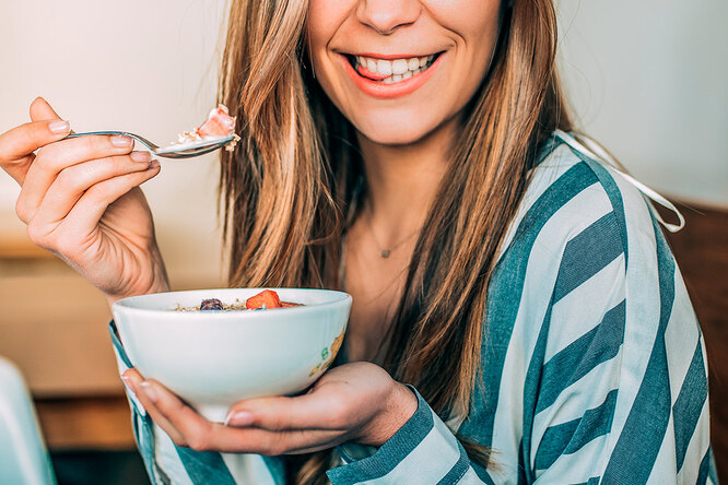 Овсянка помогает снизить уровень сахара в крови, наполняет нас клетчаткой и помогает дольше оставаться сытой, но только при одном условии: она должна быть приготовлена из минимально обработанных хлопьев. Быстрорастворимые каши, мюсли и тем более готовые хлопья – все это только навредит нашему здоровью. Варите кашу из хлопьев или даже цельных зерен, добавляйте в нее сухие или свежие фрукты – и все будет в порядке.Йогурты