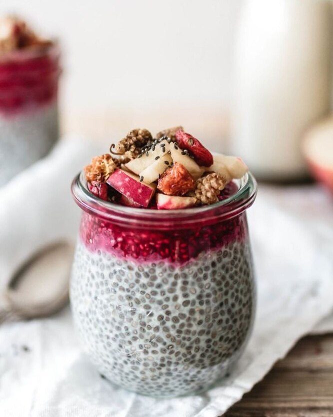 Замочите вечером семена чиа в миндальном молоке и уберите в холодильник. В готовый пудинг можно добавить орехи, ягоды, сухофрукты, мед. Получается очень вкусный завтрак.