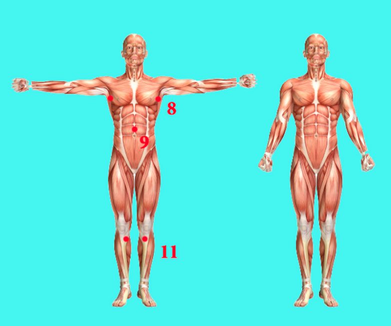 10. Парные точки находятся на концах локтевых суставов, связаны с паращитовидными железами, отвечают за производство гормона инсулина.