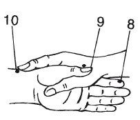 Девятая точка – симметричная, расположена у внутреннего края ногтевой лунки большого пальца кисти.