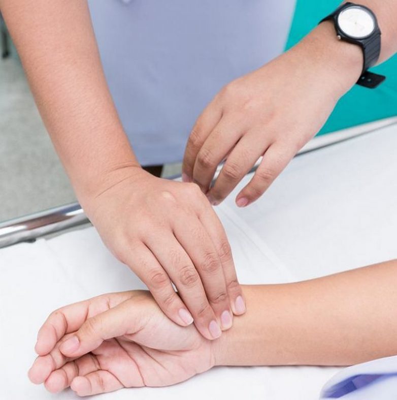 2. Легко надавить на лучевую вену (у основания большого пальца на запястье между сухожилием и костью) указательным и средним пальцами другой руки и посчитать количество ударов пульса в течение одной минуты.