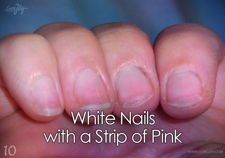 Если у вас белые ногти с розовой полоской, это может указывать на сердечную недостаточность, диабет, почечную недостаточность или заболевание печени.