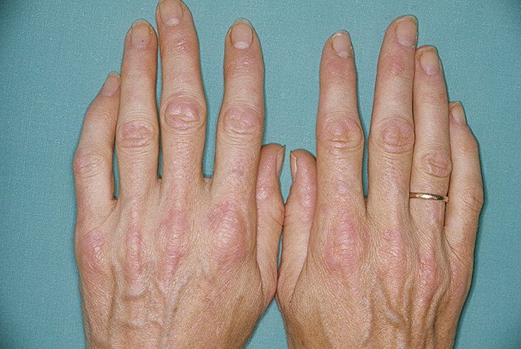 У 25% больных первым признаком болезни становятся ревматоидные узелки под кожей. Крупные шишки выступают возле воспаленных суставов, могут достигать нескольких сантиметров. Они не болят, но травмируются при случайном ударе или счесывании. Опасность составляют отложения на стенках внутренних органов, которые невозможно обнаружить без компьютерной диагностики КТ или МРТ.Ревматоидный васкулит