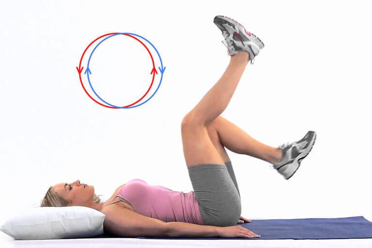 Выполняя это упражнение, держите туловище и голову полностью неподвижно. Не допускайте перенапряжения, после выполнения дайте себе отдохнуть до тех пор, пока дыхание не восстановится.Приподнимите прямую правую ногу на комфортную для вас высоту, и выполните вращательные движения (по кругу) слева направо, затем справа налево по 10 раз. Повторите то же самое для левой ноги. Отдохните и восстановите дыхание, затем приподнимите обе ноги, они должны быть прямыми и плотно сжатыми, и повторите движения в одну, а затем в другую стороны.