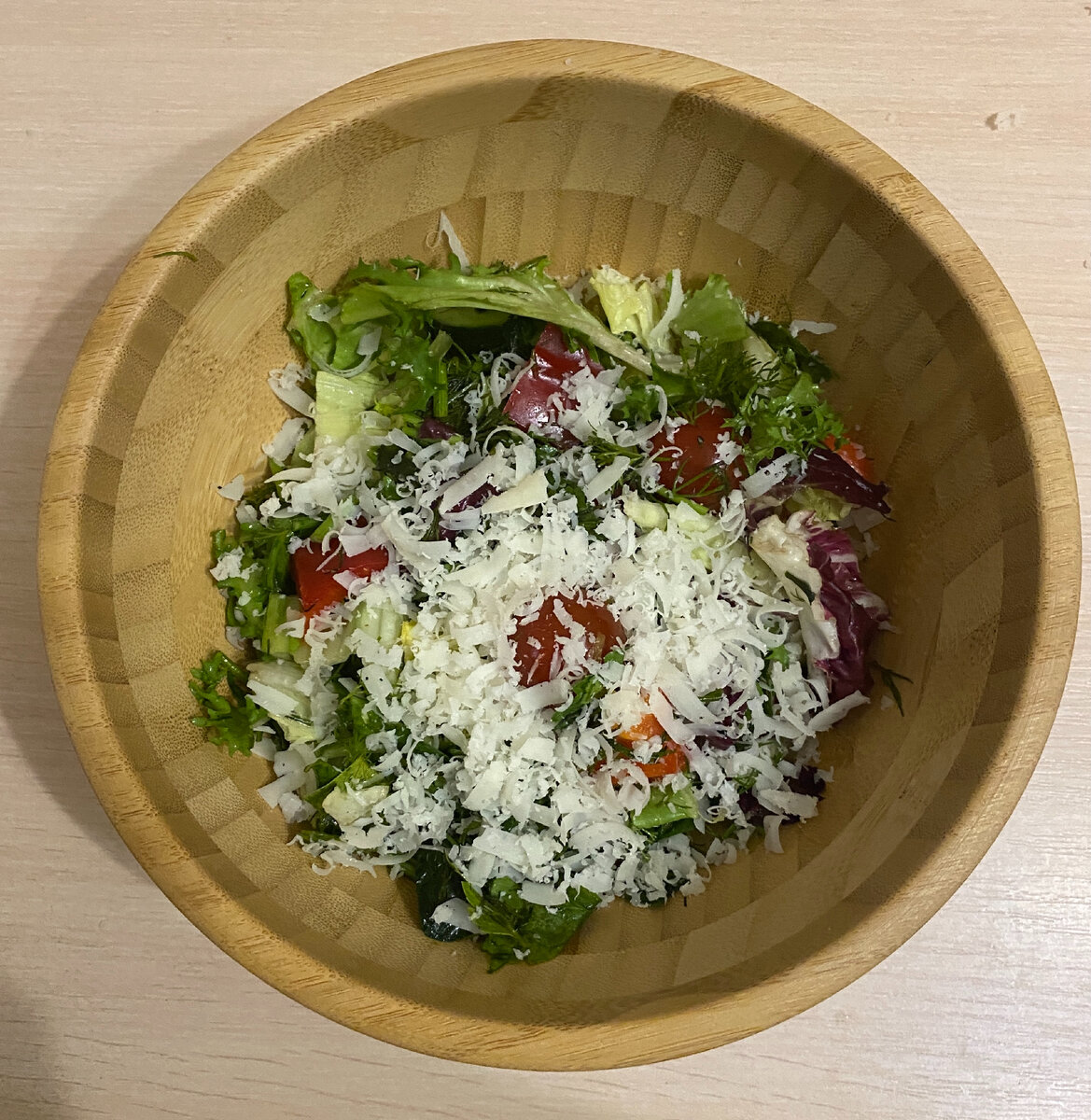 Цезарь-боул с маслом зародышей пшеницы: листовая зелень, шпинат, черри, щепотка тертого сыра, щепотка сушеного базилика. Не добавила кусочков курицы, но они там есть.