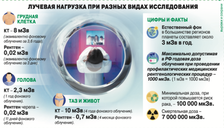 — Я бы не преувеличивал опасность компьютерной томографии. В нашей стране одна из самых жёстких систем контроля ионизирующего излучения, а современные приборы выгодно отличаются от тех, которые использовались 20–30 лет назад. Они более совершенны технически, во многих томографах установлены специальные программы, направленные на снижение доз облучения там, где это возможно. В последние годы даже появился специальный термин «низкодозная компьютерная томография», поскольку для получения изображения лёгких, суставов или зубов сегодня требуется в несколько раз меньшая доза излучения, чем в прошлом веке. Она сопоставима с бытовым облучением, которому люди подвергаются в обычной жизни (см. инфографику).