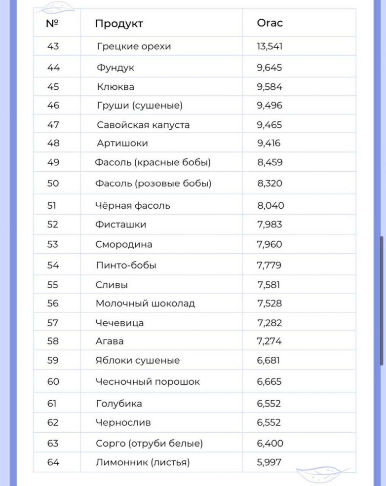 100 продуктов с наибольшей антиаксидотивной способностью