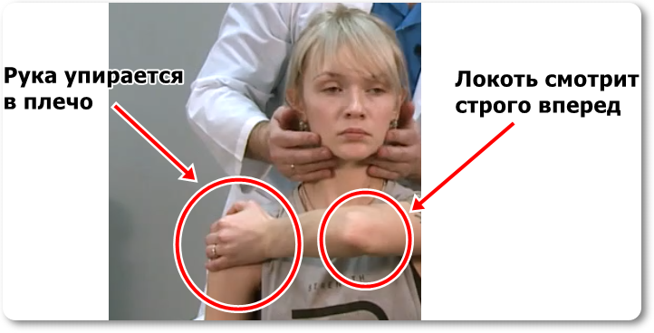 1. Поднимаем левую руку и упираем в правое плечо таким образом, чтобы рука поднялась под 90 градусов (была параллельна полу), а локоть смотрел строго вперед.