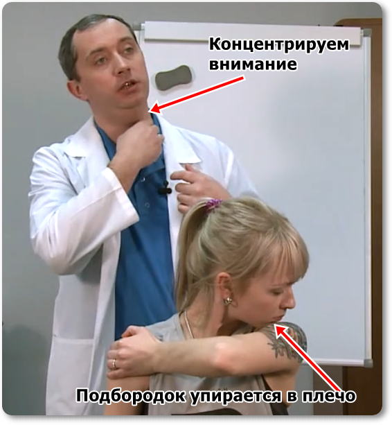3. Одновременно давим рукой на правое плечо, а подбородком на левое. В таком положении удерживаем напряжение 5, 10, 15 секунд, в зависимости от Вашего физического состояния. При этом концентрируем свое внимание на напряжении в лестничных мышцах.