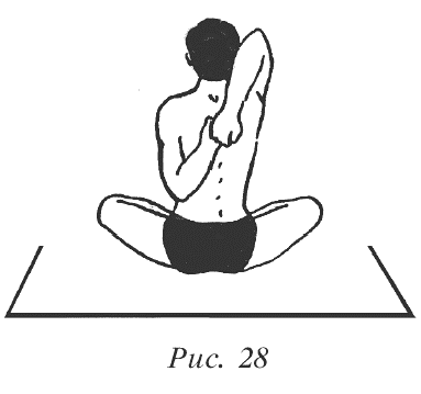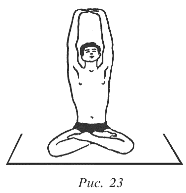 Сядьте в позу «лотоса», расположите руки за головой, сцепив пальцы на затылке. С максимальным усилием отведите локти назад, одновременно двигая головой и запрокидывая ее.После глубокого вдоха, задержав максимум воздуха в груди, выполните от 2 до 5 покачиваний туловищем вперед-назад, затем сделайте выдох. Повторите упражнение 3 раза.