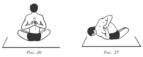 Сядьте в позу «лотоса», заведите одну руку за спину снизу, другую – сверху, соедините пальцы в «замок». Сделав глубокий вдох и задержав на вдохе воздух в груди, выполните от 2 до 6 покачиваний туловищем из стороны в сторону. Выдохнув и немного передохнув, повторите упражнение еще 3 раза, меняя положение рук.