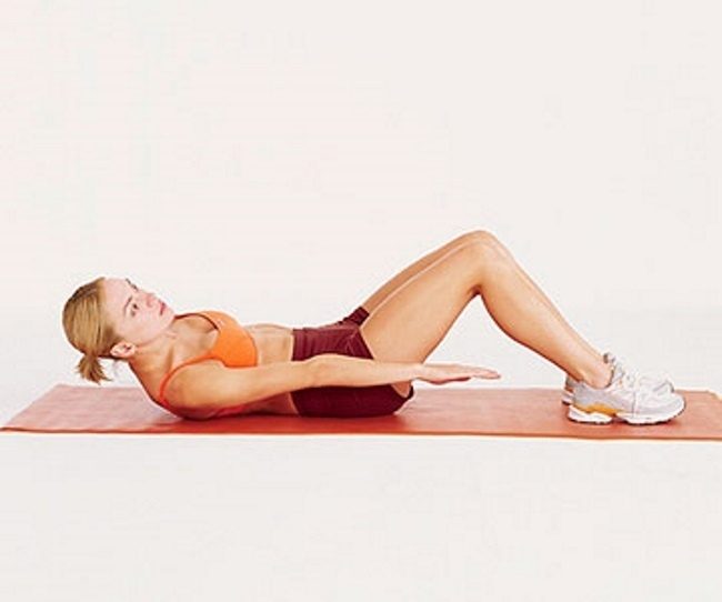Слегка выгнитесь вверх, чтобы ваш корпус чуть-чуть приподнялся над ковриком. Держите напряжение, затем опускайтесь обратно. Сделайте так 10 раз.