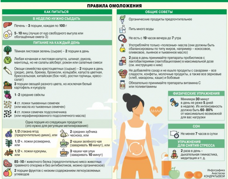 — Сегодня многие учёные убеждены, что так называемые часы метилирования — это золотой стандарт для оценки биологического возраста человека. Они стали массово применяться в клинических исследованиях, и с их помощью уже проводили изучение средиземноморской и ряда других диет, физических нагрузок, некоторых лекарств и даже полезного влияния близости парковых зон к месту проживания. На степень метилирования можно влиять, поскольку оно зависит от наличия в пище определённых питательных веществ. И в используемой здесь диете они присутствовали. Прежде всего это продукты, богатые фолиевой кислотой, бетаином, витаминами C и A, а также полифенолами с таким же действием — их много в зелёном чае, ягодах, куркуме, розмарине, чесноке и т. д. В программу питания также входили животные белки с высокой плотностью питательных веществ (печень, яйца) и бактерия-пробиотик, производящая фолиевую кислоту в нашем кишечнике. Дополнительно диета ограничивала углеводы и включала умеренное прерывистое голодание (12 часов голода). В целом подход авторов соответствует принципам здорового образа жизни, и его положительное влияние на эпигенетические часы (снижение за 8 недель эксперимента возраста метилирования в среднем на 2 года) очень обнадёживает.
