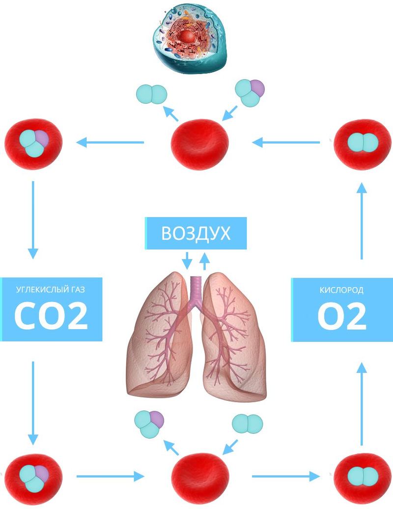 В альвеолах идет обмен молекул CO2 на молекулы O2, которые транспортируются по организму. Эритроциты с гемоглобином доставляют кислородные молекулы к органам и тканям и снова забирают отходы жизнедеятельности клеток – CO2.