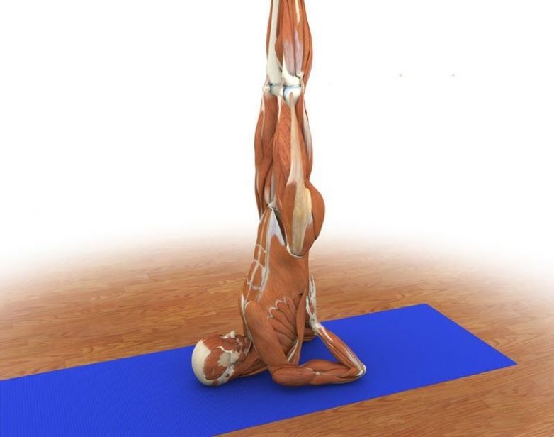 на выдохе опираясь ладонями о пол, поднять вертикально ноги;