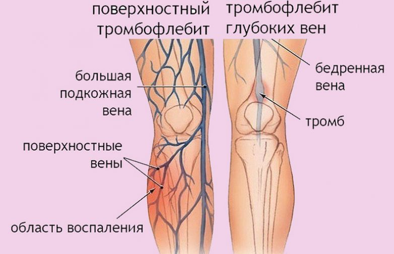 Тромбофлебит поверхностных вен (слева) и глубоких вен (справа)