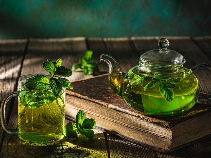 Понадобится 500 мл воды, яблоко, зеленый чай, корица 1/3 ч.л. и мед по вкусу. Заливаем ингредиенты горячей водой, настаиваем 5 минут и наслаждаемся полезным, вкусным чаем. Также можно добавить апельсин (дольки или цедры) — это придаст напитку новогодний аромат.Чай с мятой