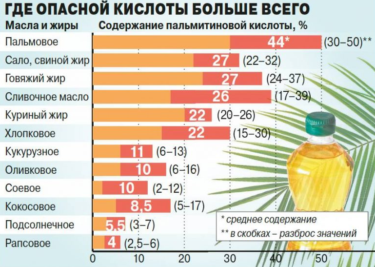 За прошедшие годы появились данные о связи пальмового масла с раком груди, со злокачественными опухолями поджелудочной железы и колоректальным раком (опухоли толстой и прямой кишки). А испанцы, продолжив свои исследования, расшифровали механизм негативного действия пальмового масла. Всё дело в его главной жирной кислоте, она называется пальмитиновой. На её долю приходится 30–50% всех жирных кислот, и это больше, чем в каком-либо другом масле и жире (см. инфографику).