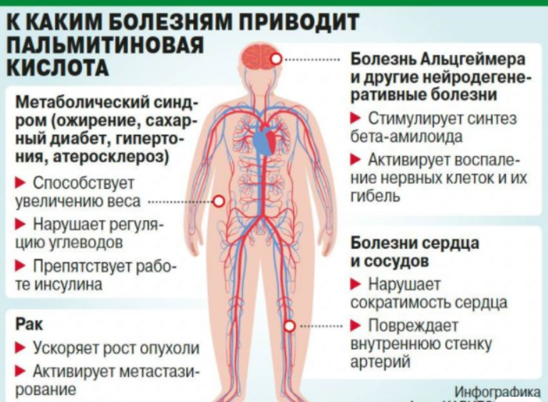 Причём вредно это не только из-за рака. Немало исследований показывают, что пальмитиновая кислота способствует развитию и иных заболеваний. Группа китайских учёных из Гонконга в 2019 г. подготовила обзор таких работ и сделала вывод: «Пальмитиновая кислота среди всех насыщенных жирных кислот уникальна своей ролью в развитии метаболического синдрома, сердечно-сосудистых болезней, рака, нейродегенеративных заболеваний и воспаления» (см. инфографику). Это объясняют тем, что она способна вмешиваться в регуляцию разных процессов в клетке, приводя к негативным последствиям. Учёные призывают больше изучать эти механизмы, так как они могут привести к созданию новых лекарств.