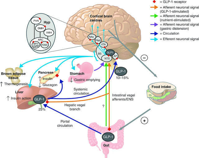 Гипоталамус регулирует ключевые процессы обмена веществ в организме. Если мы с вами говорим про голод и температуру, то связь их проста. Гипоталамус может регулировать энергию и удерживать нормальный вес либо контролируя процесс поступления пищи (аппетит) либо регулируя теплоотдачу и сжигание (уровень физактивности, работа бурого жира, щитовидки и т.п.).Возможными механизмами регулирующими работу центра аппетита, являются уровни глюкозы, инсулина, свободных жирных кислот и целый ряд гормонов. Вместе они образуют сложные регуляторные сети. После приема пищи в крови повышается концентрация некоторых гормонов, например лептина и инсулина. Голодание, соответственно, ведет к снижению их концентрации.