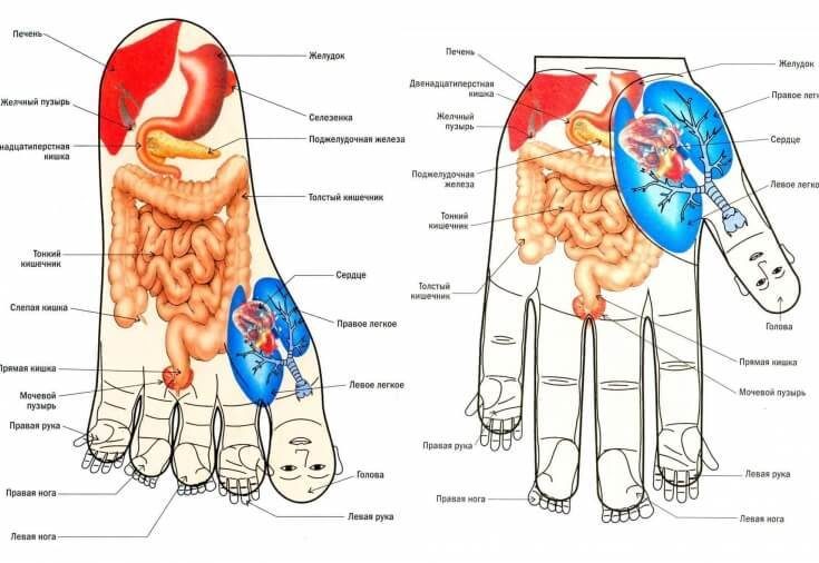 Так, каждый палец нашей кисти соответствует определенной части тела – большой палец связан с головой, мезинец и указательный с нашими руками, а безымянный и средний с нашими ногами. Если рассматривать ладонь, то область под большим пальцем отвечает за грудную клетку, все остальное пространство – это брюшная полость. Тыльная сторона руки отвечает за состояние спины, а линия, проходящая через середину руки, представляет собой позвоночник.
