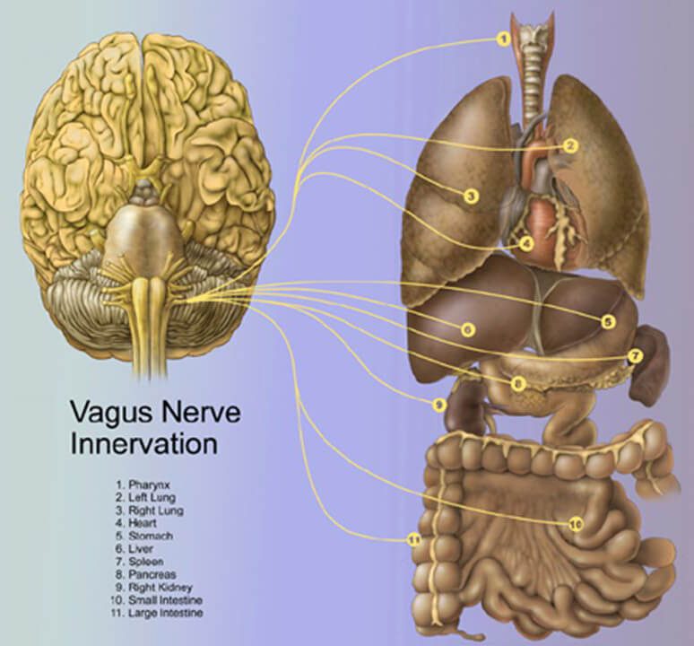 Блуждающий нерв постоянно отправляет чувствительную информацию о состоянии органов тела в мозг. На самом деле, 80-90% нервных волокон в блуждающем нерве предназначены для передачи информации от внутренних органов в мозг. Такая же цепь связи существует и в обратном направлении – через блуждающий нерв также поступают сообщения от мозга во внутренние органы, содержанием которых является команда успокоиться или подготовиться к обороне в стрессовых ситуациях. Ваш блуждающий нерв – это главнокомандующий, который помогает сохранять спокойствие в стрессовых ситуациях.