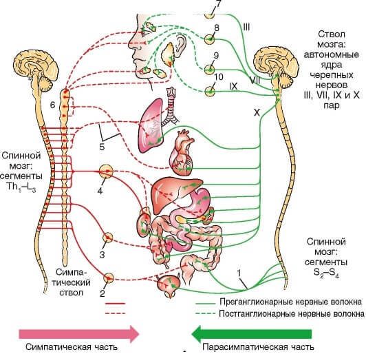 Так, при раздражении (или повышении тонуса) симпатических нервных волокон учащается ритм сердечных сокращений, повышаются артериальное давление и температура тела, наблюдается побледнение кожных покровов. Происходит расслабление мускулатуры бронхов, пищевода, желудка, замедляется перистальтика (мышечные сокращения) кишечника, возникает склонность к запорам, нарастает содержание сахара в крови, повышается свертываемость крови.