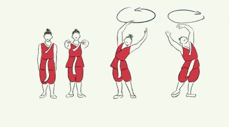 повернуть корпус влево, «рисуя» ладонями восьмерку, когда руки будут ближе к груди – перевернуть ладони (теперь левая сверху, а правая снизу);