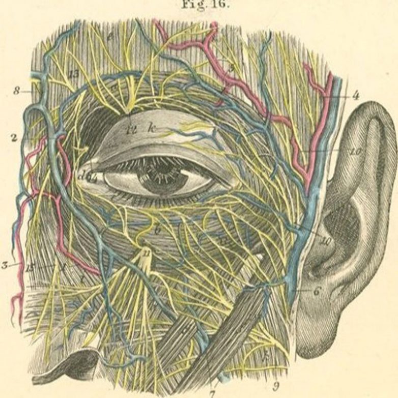Т. А.: двигательная часть тройничного нерва, ветвь поверхностной височной артерии, вторая ветвь тройничного нерва.