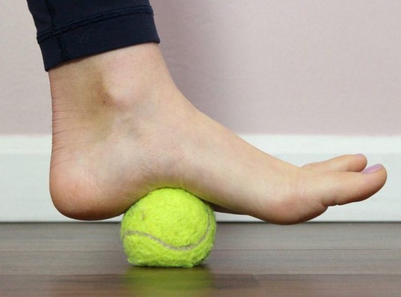 Зажимая мячик пальцами ноги, мы тем самым укрепляем подошвенную фасцию.