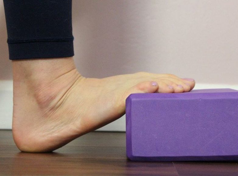 Укладываем блок для йоги на пол. Ставим носок правой стопы с краю на блок. Пятка при этом удерживается на полу.