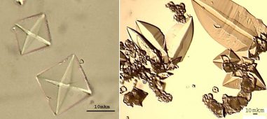 Кристаллы оксалата кальция выделяются с мочой и имеют характерную форму октаэдров («почтовые конверты») разной величины. Встречаются кристаллы другой формы, особенно в тех случаях, когда образуются сростки. Естественный цвет их серый, но так как они легко ранят слизистую оболочку, кровяной пигмент может окрашивать их в черный цвет. Кристаллы оксалатов встречаются в кислой и щелочной моче.