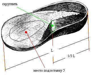 4. Приклеить вставку под пяткой (от середины, под углом 25-30˚). Для формирования внутреннего и поперечного сводов путём скручивания переднего отдела стопы относительно заднего.