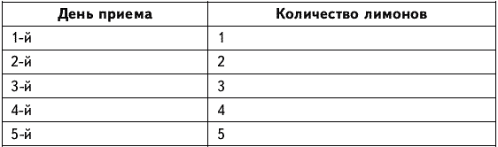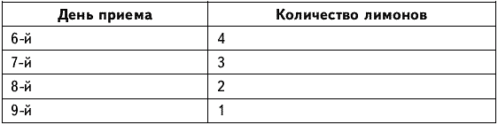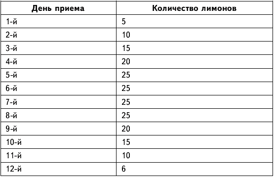 Лимонный сок должен быть только чистым, без добавления сахара или воды, пить его лучше за полчаса до еды или спустя час после приема пищи через трубочку, чтобы не повредить эмаль зубов. После этого ополосните рот водой, добавив на стакан воды 1 ч. ложку соды, чтобы нейтрализовать оставшуюся во рту кислоту. Для лечения понадобится не менее 200 плодов. Схему принятия лимонов иллюстрирует таблица.